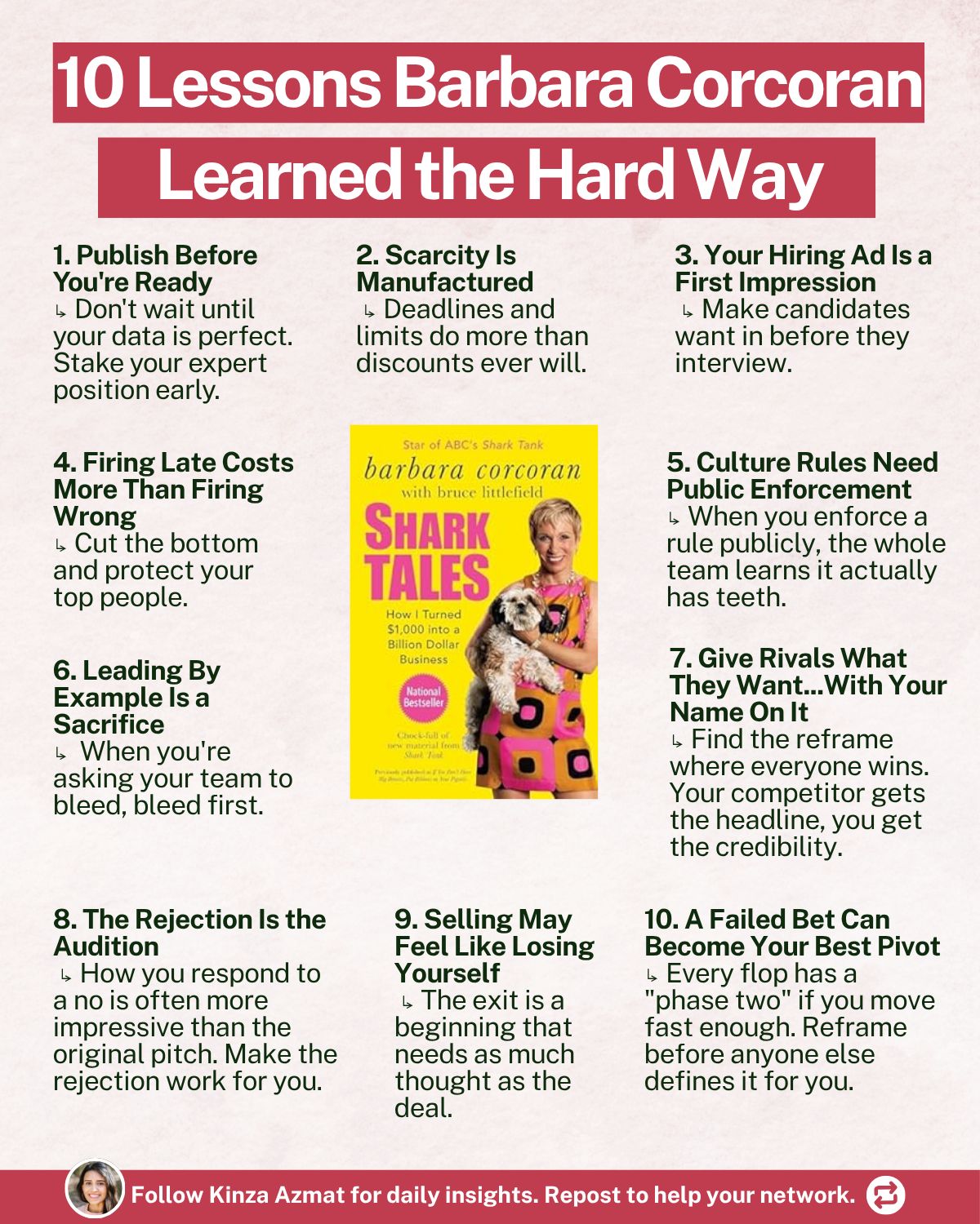 She bled first. When the company was $264K in the hole with its credit line pulled, she didn't give a speech about resilience. She took a second job at a competing developer for $200K/yr and fed her entire salary back into The Corcoran Group. She didn't announce it as noble sacrifice. But her team noticed anyway and rallied around her. You canāt ask people to bleed for a business you aren't willing to bleed for yourself.